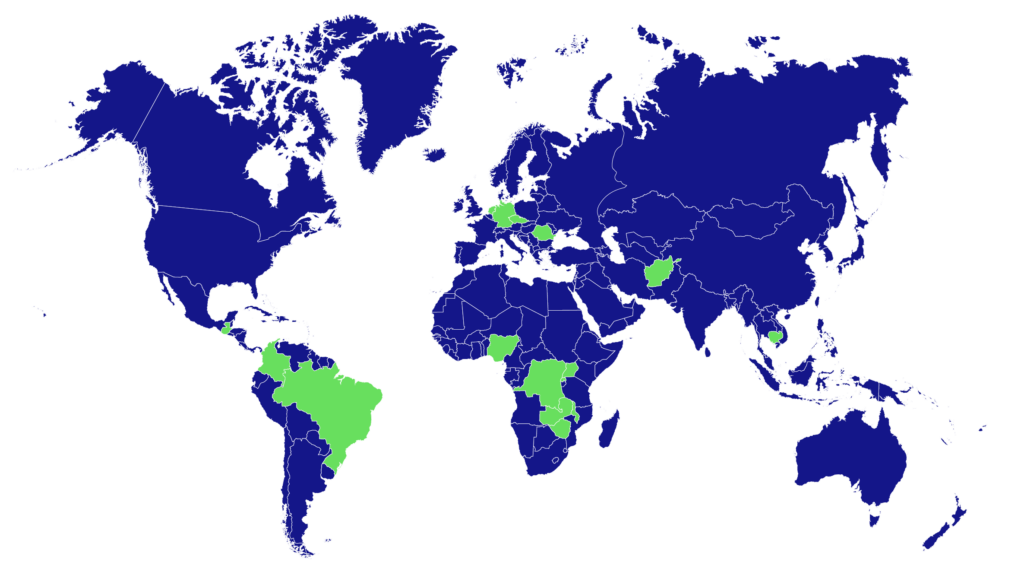 Afghanistan | Brasilien | Demokratische Republik Kongo | Deutschland | Guatemala | Kambodscha | Kolumbien | Malawi | Niederlande | Nigeria | Ruanda | Rumänien | Sambia | Simbabwe | Tschechische Republik | Uganda