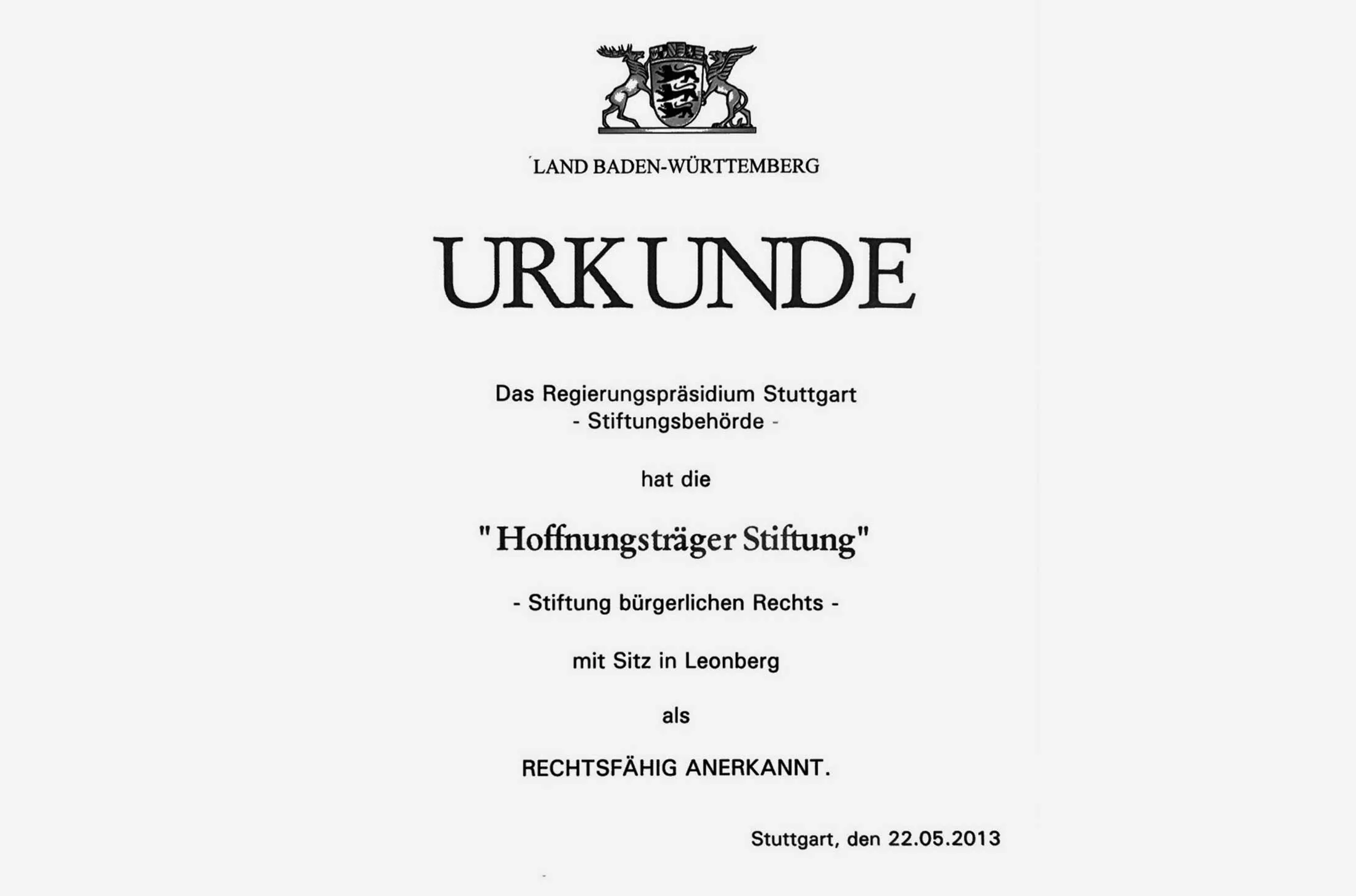 Die Hoffnungsträger Stiftung wurde am 22.05.2013 vom Regierungspräsidium Stuttgart als rechtsfähige Stiftung des bürgerlichen Rechts anerkannt.